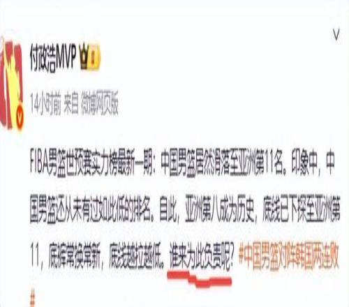 中国男篮暴跌至亚洲第11名,付政浩发声呼吁中国男篮尽快换帅