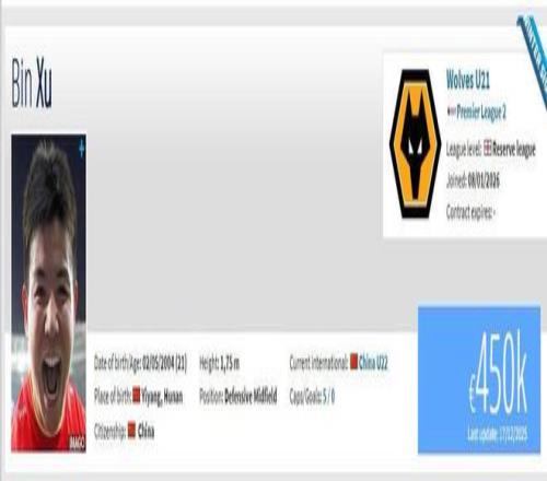 据红星新闻援引五星体育消息:德国转会市场更新信息,湖南伢子徐彬已成为英超狼队U21梯队的一员。徐彬司职防守型中场,也能胜任中前卫和中后卫,其45万欧元的身价也创下了个人职业生涯的新高。